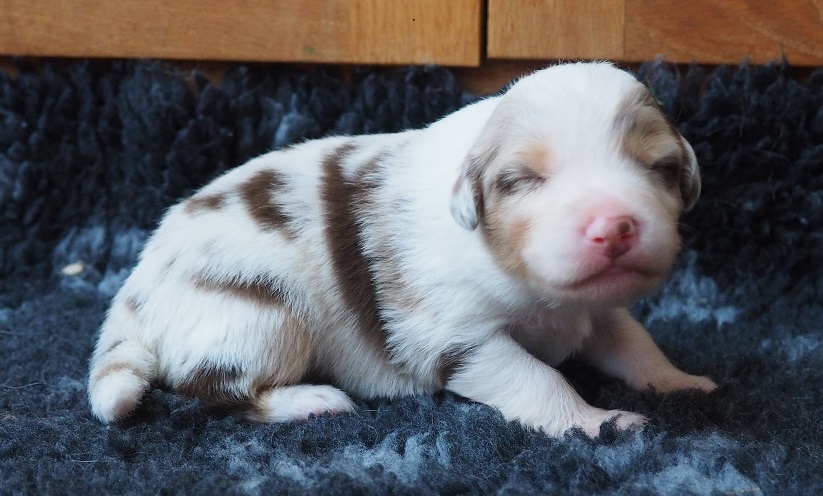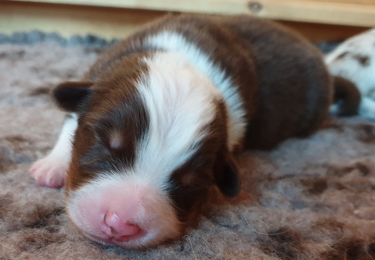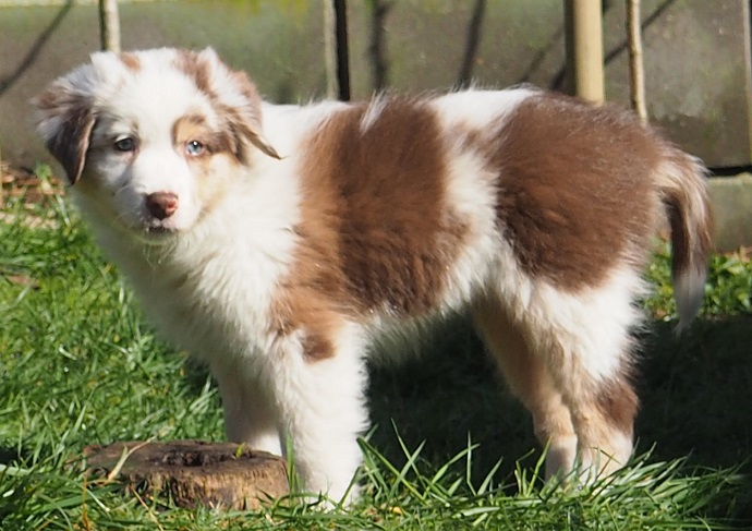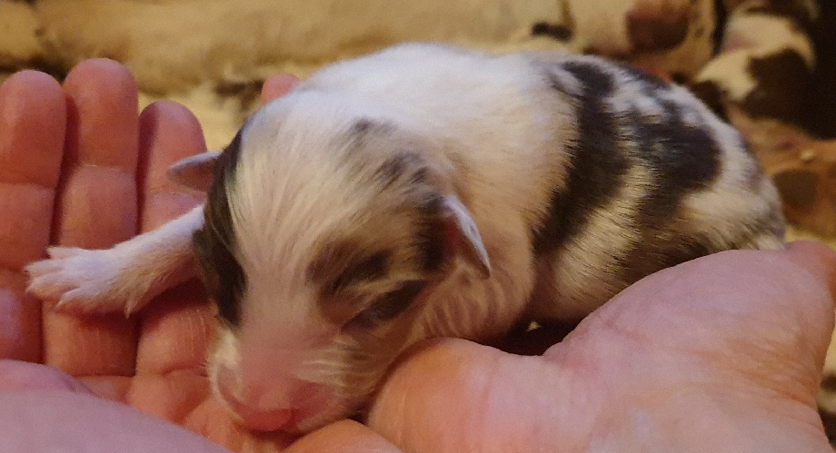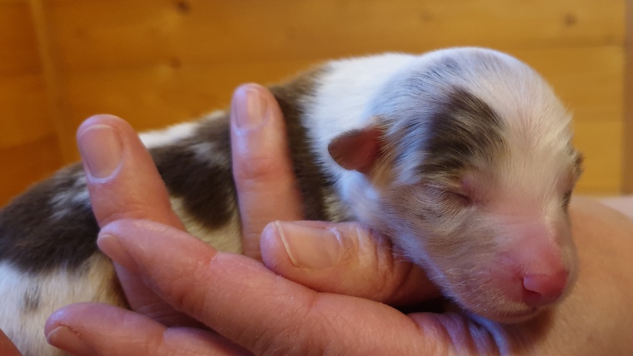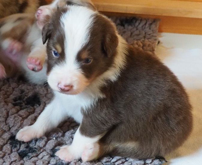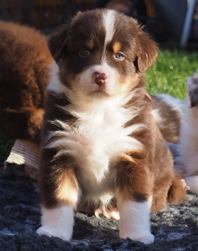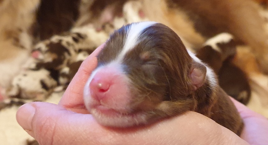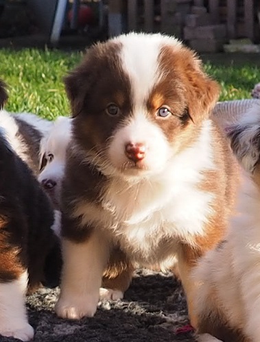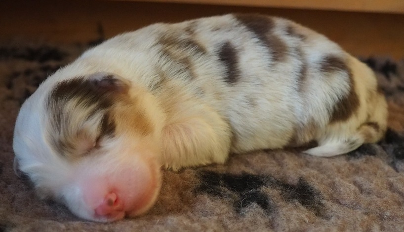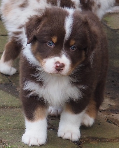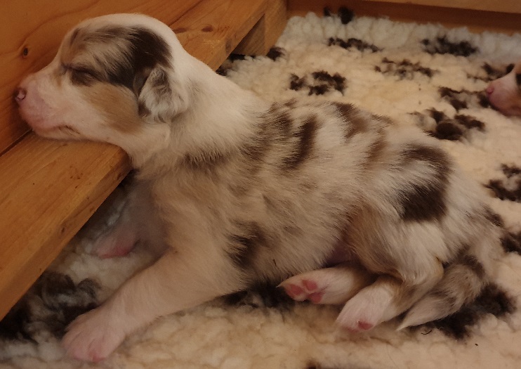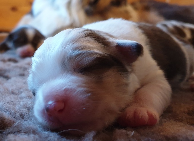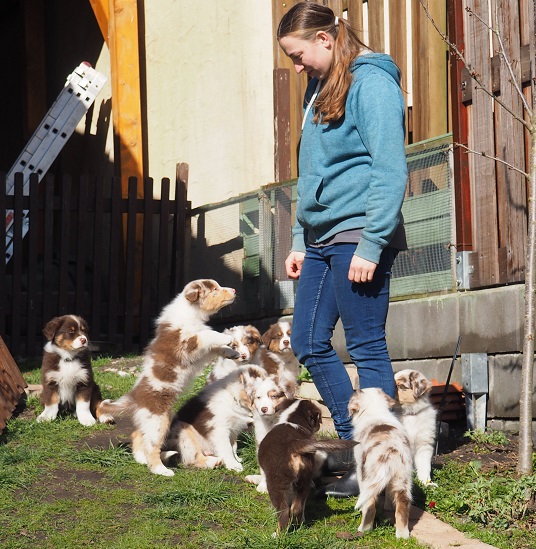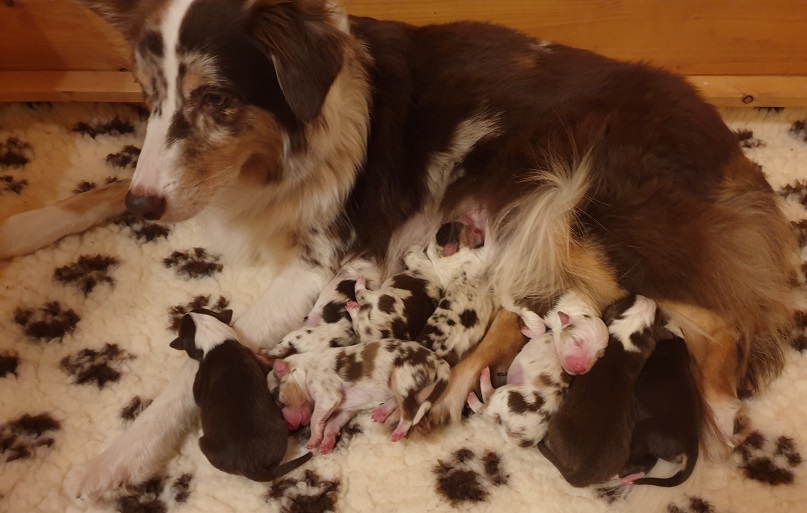 Es sind 4 Mädels, 1 in red tri und 3 in red merle und 5 Jungs, 2 in red tri und 3 in red merle.