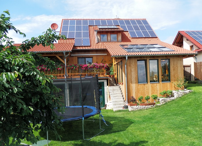 Hier wohnen wir, in einem Holzhaus am Rande einer Neubausiedlung.