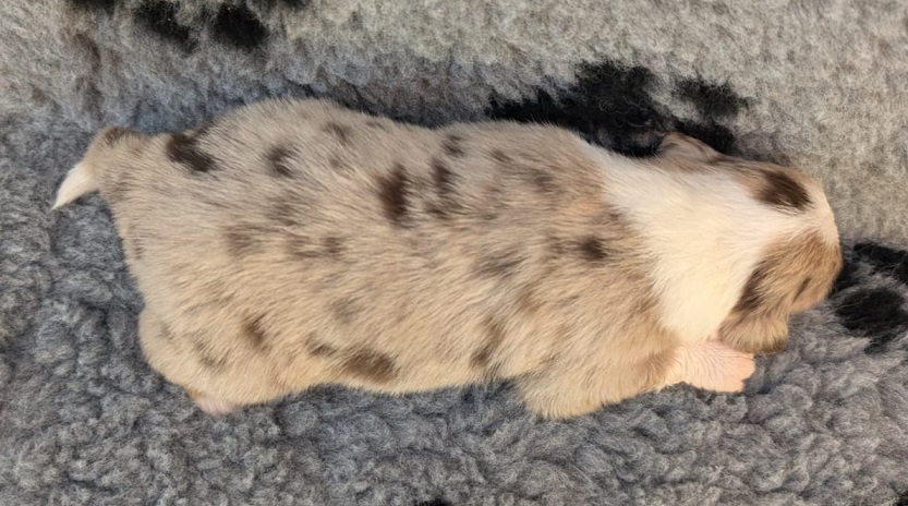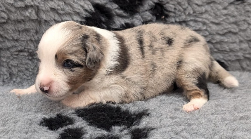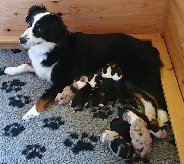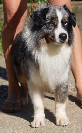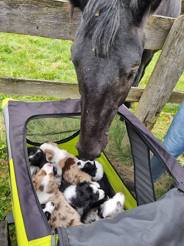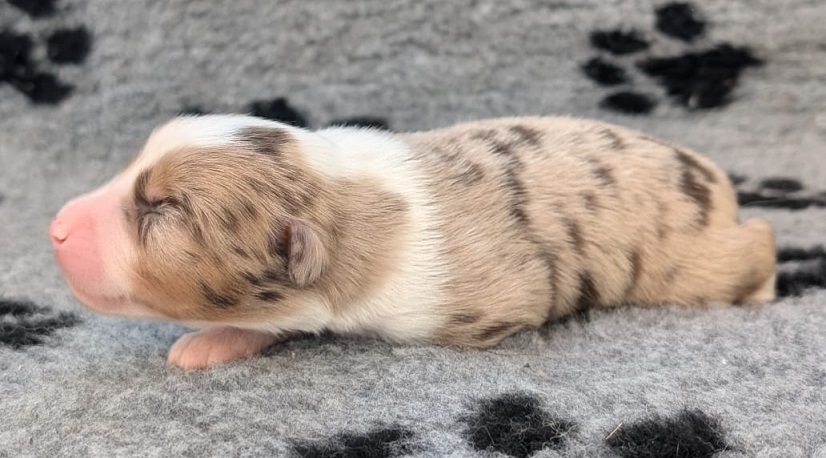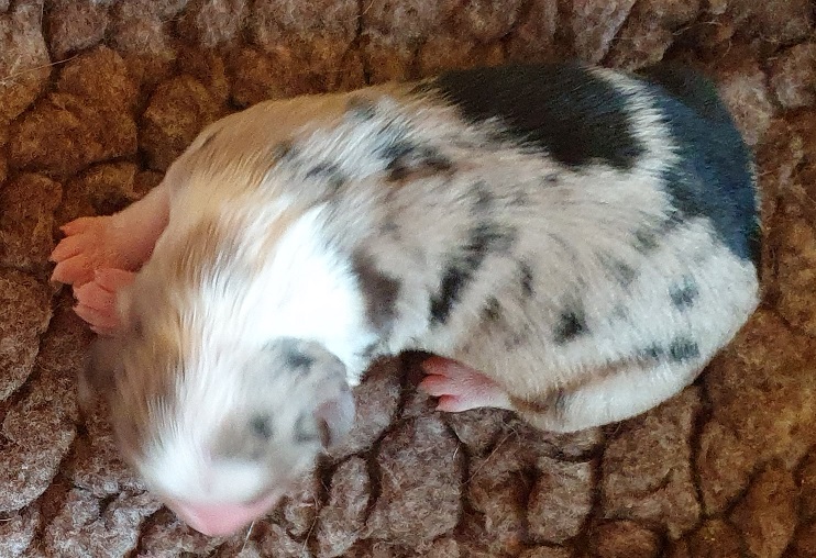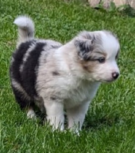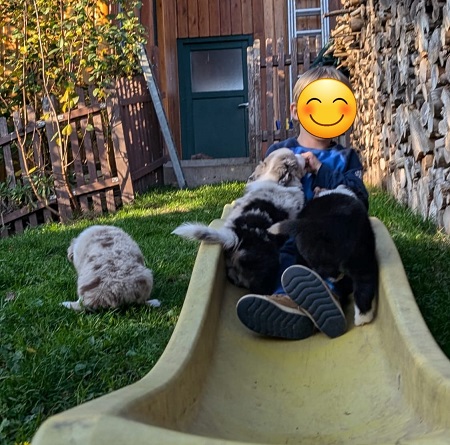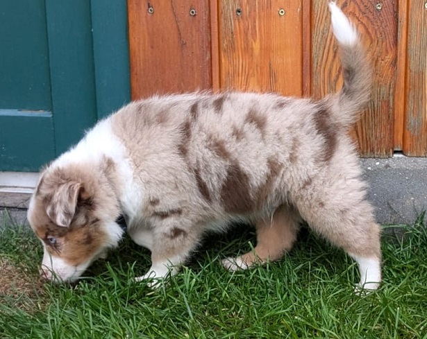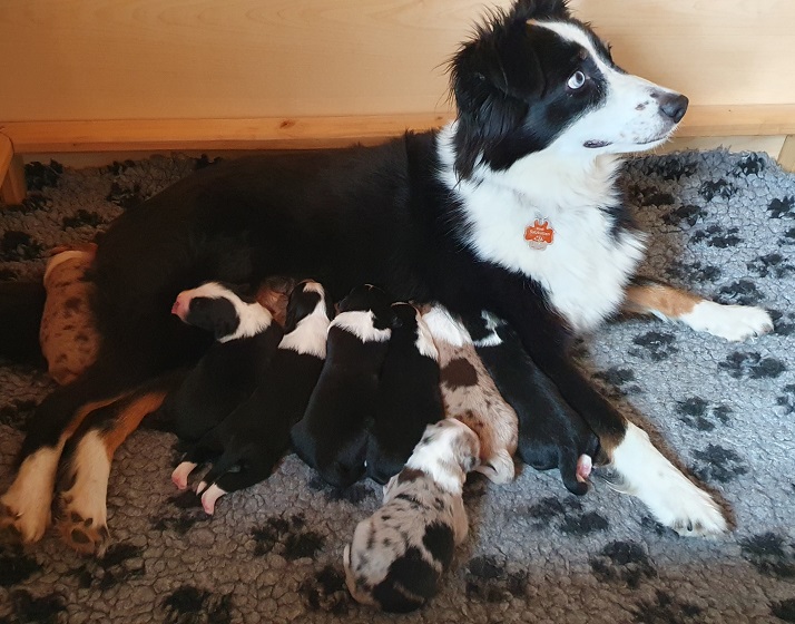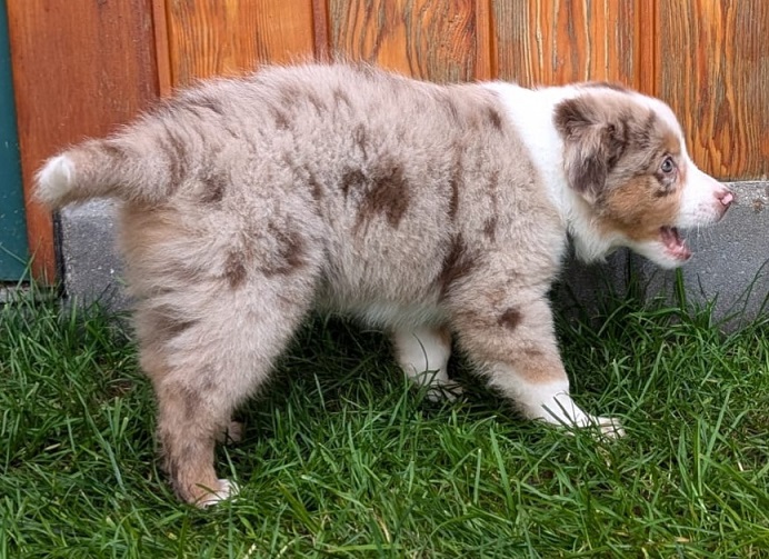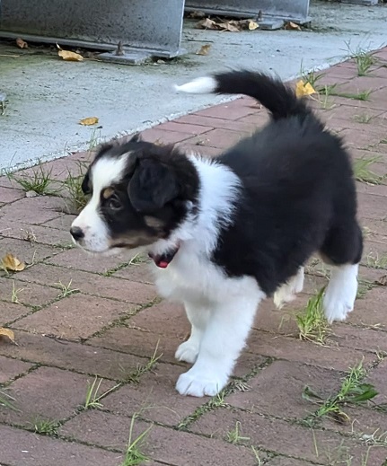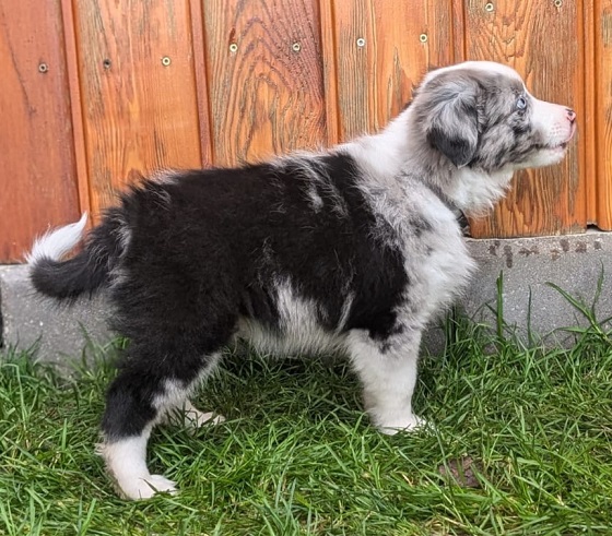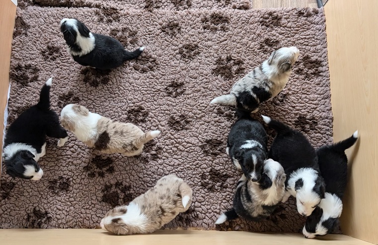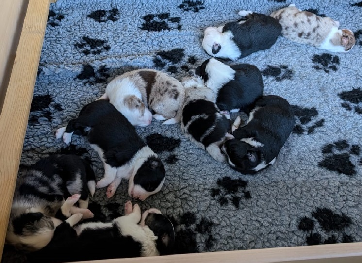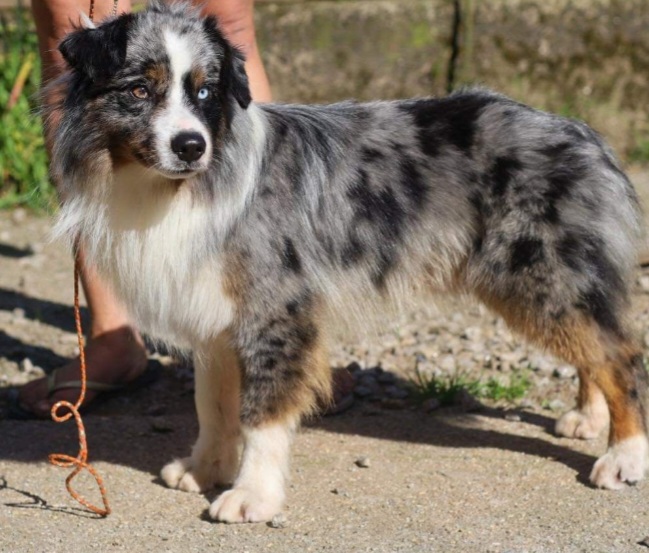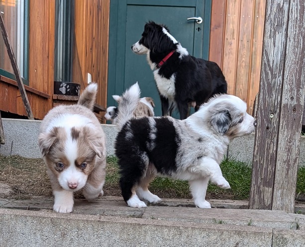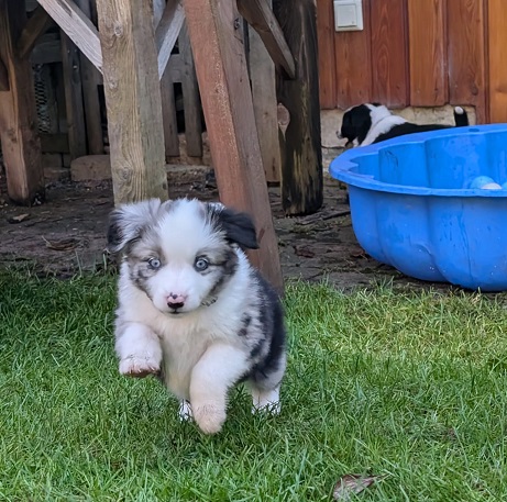 Mini Australian Shepherd Wurf: Picot und Phoebe Am 5.9. hat unsere Phoebe 9 kleinen Welpen das Leben geschenkt. Es sind 3 Hündinnen in black tri und 6 Rüden 2 in black tri, 2 in blue merle und 2 in red merle. Lange haben wir nach einem Deckrüden für unsere Maus gesucht. Da Phoebe mit ihren 46 cm eine relativ große Hündin ist, haben wir extra nach einem kleine Rüden gesucht. Bei Isabelle und den Lucky Hearts sind wir auf den kleinen Picot gestoßen. Picot ist erst im Frühjahr aus Portugal nach Deutschland gekommen und einfach nur toll. Bildschön, mit besten Untersuchungsergebnissen und mit nur 38,5 cm relativ klein. Einen lieben Dank an Isabelle, dass der süße Picot der Papa von Phoebes Welpen werden durfte. Phoebe und Picot haben alle nötigen Untersuchungen: Phoebe HD A2/ ED 0 CEA, PRA, HSF4, NCL, DM, CMR1, EIC, HUU, IGS, MH, von Willebrand, Hüftinstabilität 1 und 2 frei und MDR1 +/-. Mehr über Phoebe erfahrt ihr unter "unsere Hunde" "Hündinnen" und dann "Phoebe". Picot Picot ist HD, PL, ED, OCD und ÜGS frei außerdem ist er MDR, PRA, NL, HSF4, CEA, DM und NAD frei. Mehr über Picot erfahrt ihr auf der Homepage von den Lucky Hearts Mini Australian Shepherds unter : Tutti Frutti of American madness - Lucky Hearts Miniature Australian Shepherd (lucky-hearts.com)